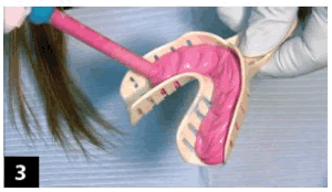 3. Place the mixing tip into the heavy body material and load it into the impression gun. Discard the first inch of material on every new mixing tip. Set your timer for the working time of your material, then squirt the heavy body into the tray. Fill the tray from one side to the other. Don’t lift the tip out of the material, or you’ll get air bubbles in the impression.