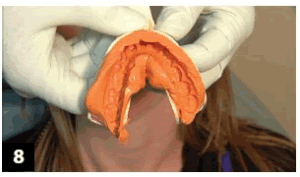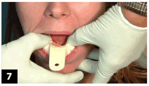 7. Press the tray into the teeth, but not too hard – you don’t want the teeth to push all the way through the impression material and touch the tray. Set your timer for the intra-oral set time of your light body material, and keep pressure on the tray until the impression has set.