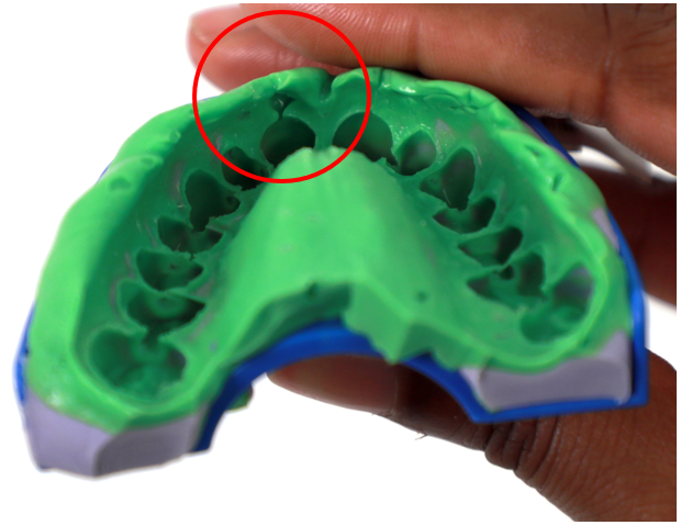 • Description: The complete tooth anatomy and/or gumline was not fully captured by the impression material around it.